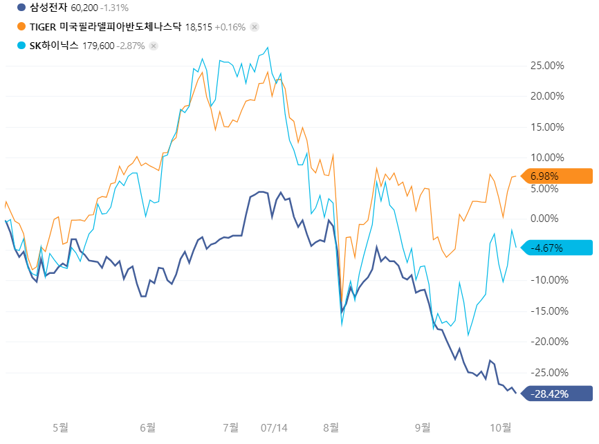 필라델피아 반도체 지수는 달리는데 삼성과 SK하이닉스만 유독 힘을 못쓴다면야 금투세니 코리아 디스카운트니 생각을 해볼 수 있겠지만, SK는 동행하는데 삼성만 못따라가는 건?? 삼성에 제기되고 있는 매우 근본적인 문제 제기들이 여전히 해결되지 않고 있다고 봐야 할 것이다.