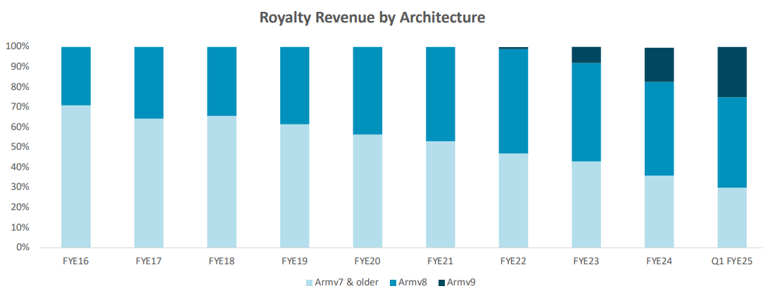ARM의 사업 모델은 고유의 명령어 집합 아키텍처(ISA)를 반도체 제조업체 및 파운드리에게 라이선스하고, 고객이 ARM 기반 칩을 설계하고 출하할 때마다 단위당 로열티를 받는 방식이다. ARM도 당연히 AI를 주요 성장 동력으로 보고 있으며, 최신 제품인 Armv9에서는 AI와 머신러닝에 특화된 아키텍처임을 내세우고 있다. 최근에는 애플 아이폰 16에 ARM의 최신 CPU 아키텍처인 Armv9가 사용됨이 알려지며 7% 가량 주가가 급등하기도 했다. v9는 이전 세대인 V8 대비 두 배의 로열티 수익을 가져올 것으로 보인다.